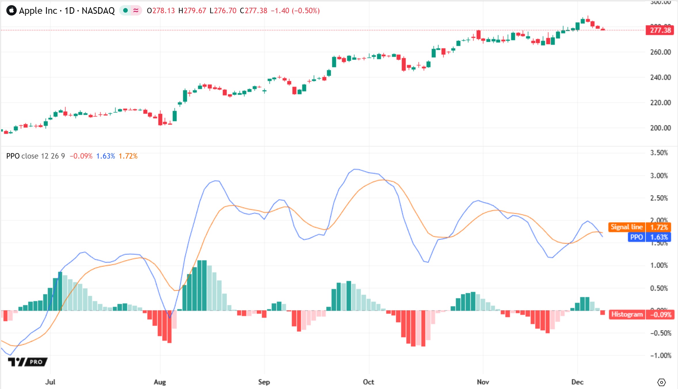 El indicador traza los valores PPO y de señal como líneas, y los valores del histograma como columnas codificadas por colores. También muestra una línea horizontal cero para distinguir los valores positivos y negativos.