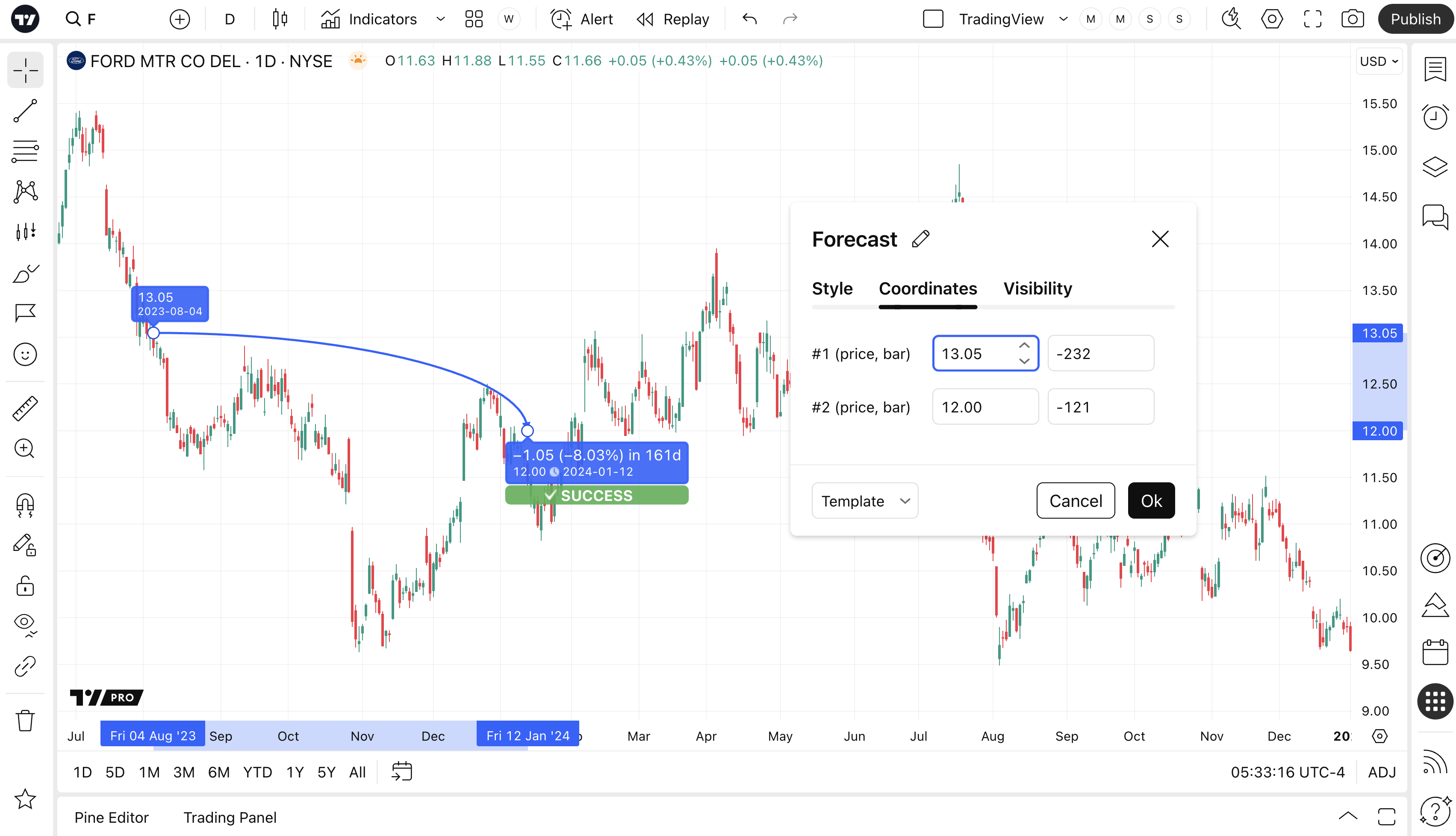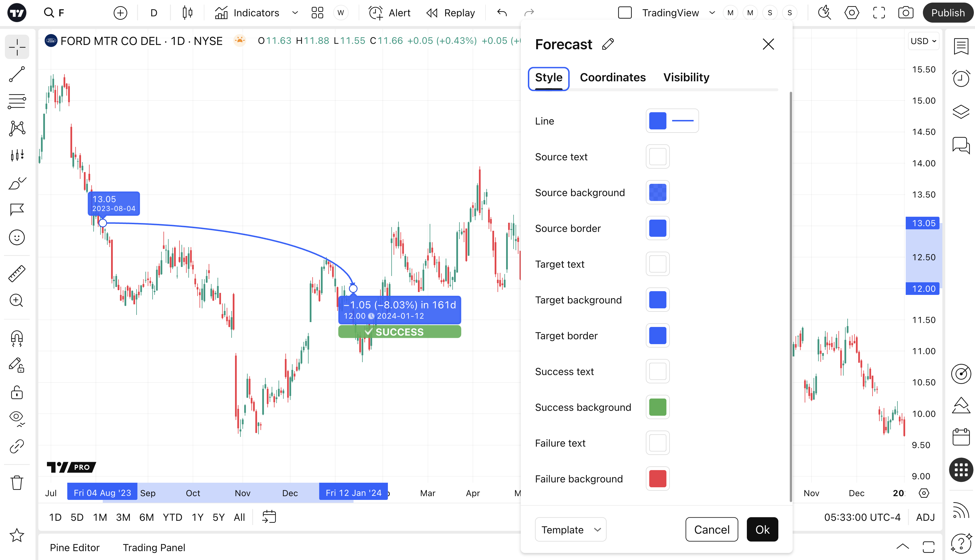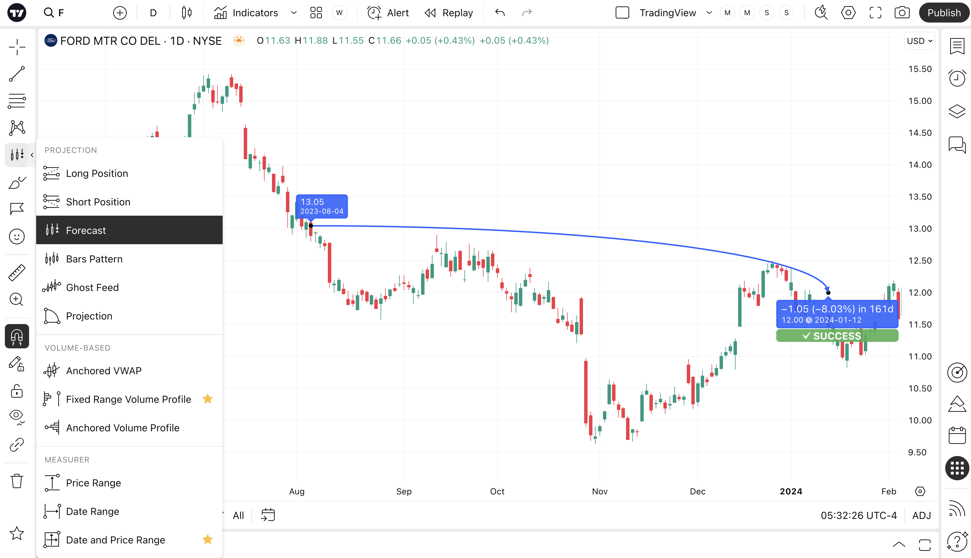 Forecast is a highly useful drawing tool, especially when used in the context of sharing trade ideas with the rest of the TradingView community. Forecast allows user to place an entry and an exit price for a trade. However, it also allows user to define the trade's duration by extending the forecast line. As time progresses (and prices changes), the forecast will automatically be deemed a "success" or a "failure".