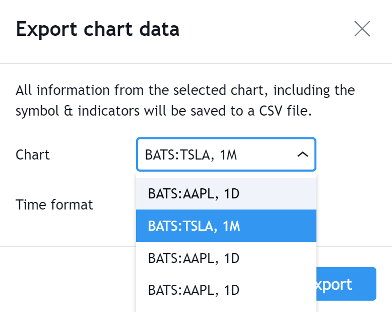 Puede guardar los datos del gráfico, incluidos los tickers y los indicadores, en un archivo CSV. A continuación, puede importarlo a un programa de hojas de cálculo para realizar análisis más detallados.