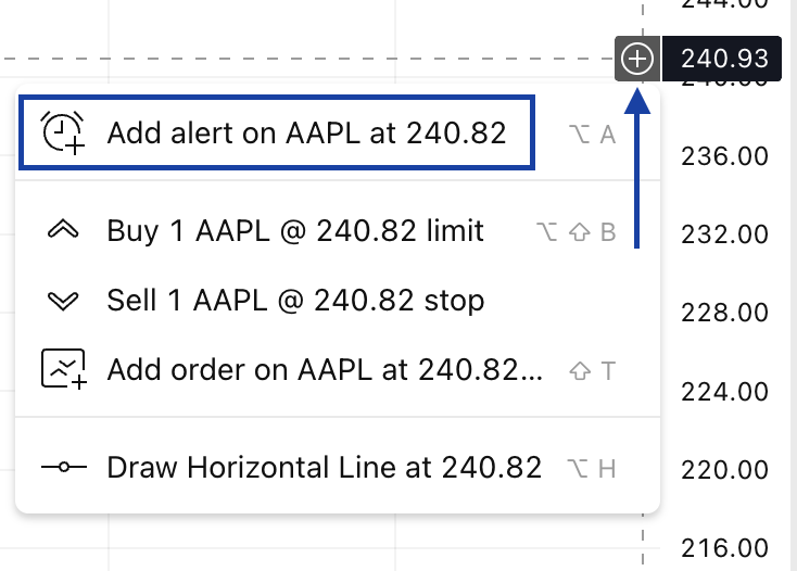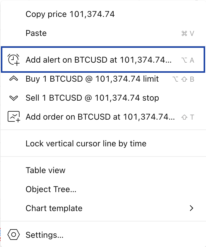 Se pueden crear alertas en series de datos, gráficos de indicadores, órdenes de estrategia y objetos de dibujo. Las alertas sobre series de datos son independientes de los intervalos de tiempo, mientras que las alertas de estudios, estrategias y dibujos dependen del intervalo porque se tiene en cuenta al calcular los indicadores.
