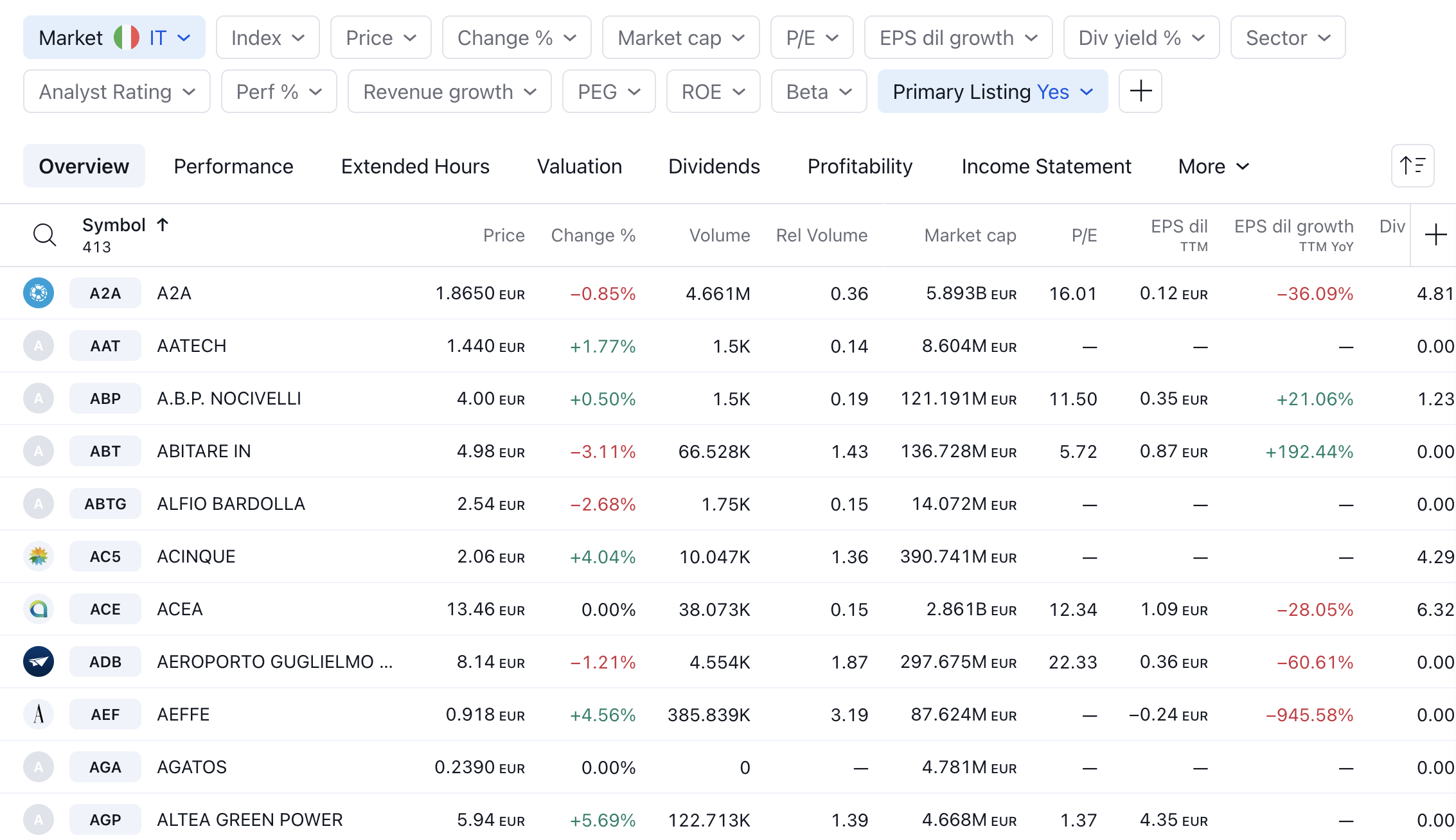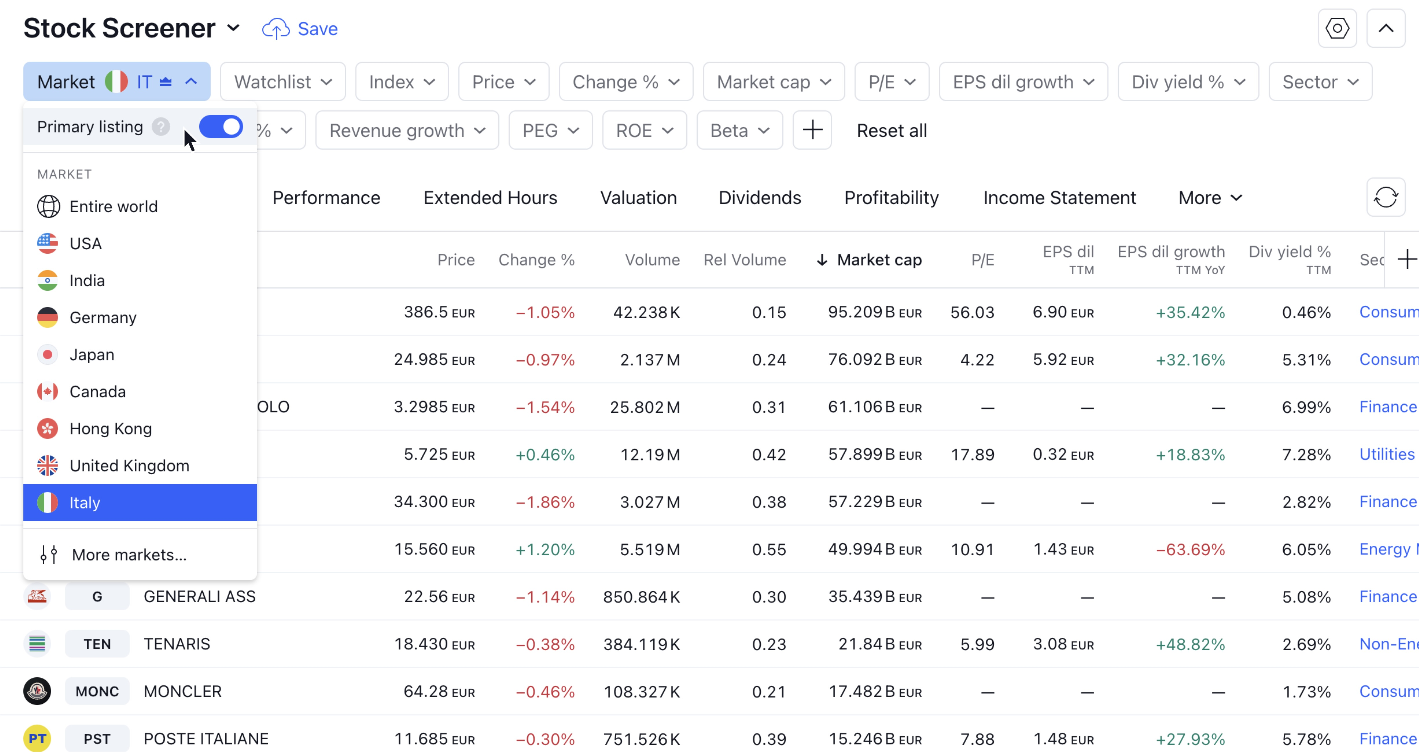 Si solo desea ver los símbolos con su listado principal en el mercado italiano, puede hacerlo: