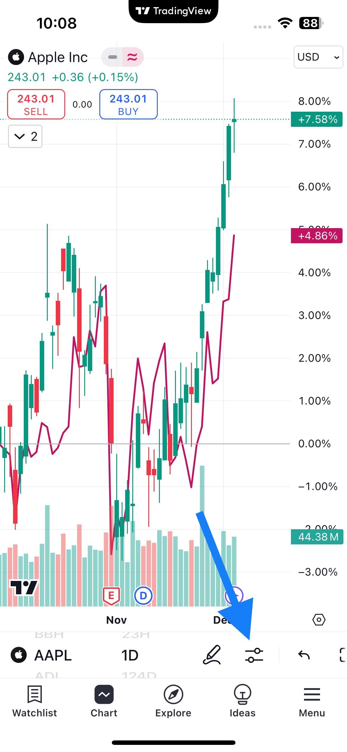 Cuando abra la aplicación móvil iOS, se mostrará el último gráfico que haya visto en el navegador web o en la aplicación TradingView Desktop.