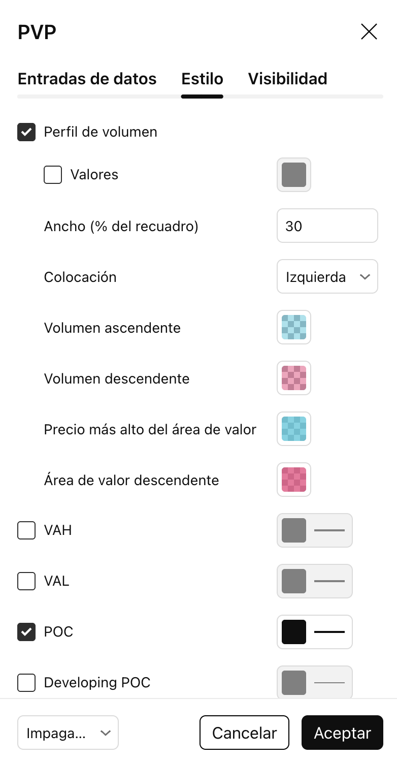 Importante: puede obtener más información sobre las características que comparten todos los indicadores de perfil de volumen en el artículo del Centro de ayuda Indicadores de perfil de volumen: conceptos básicos. El texto siguiente describe características exclusivas de este indicador de Perfil de Volumen en particular.Cálculo