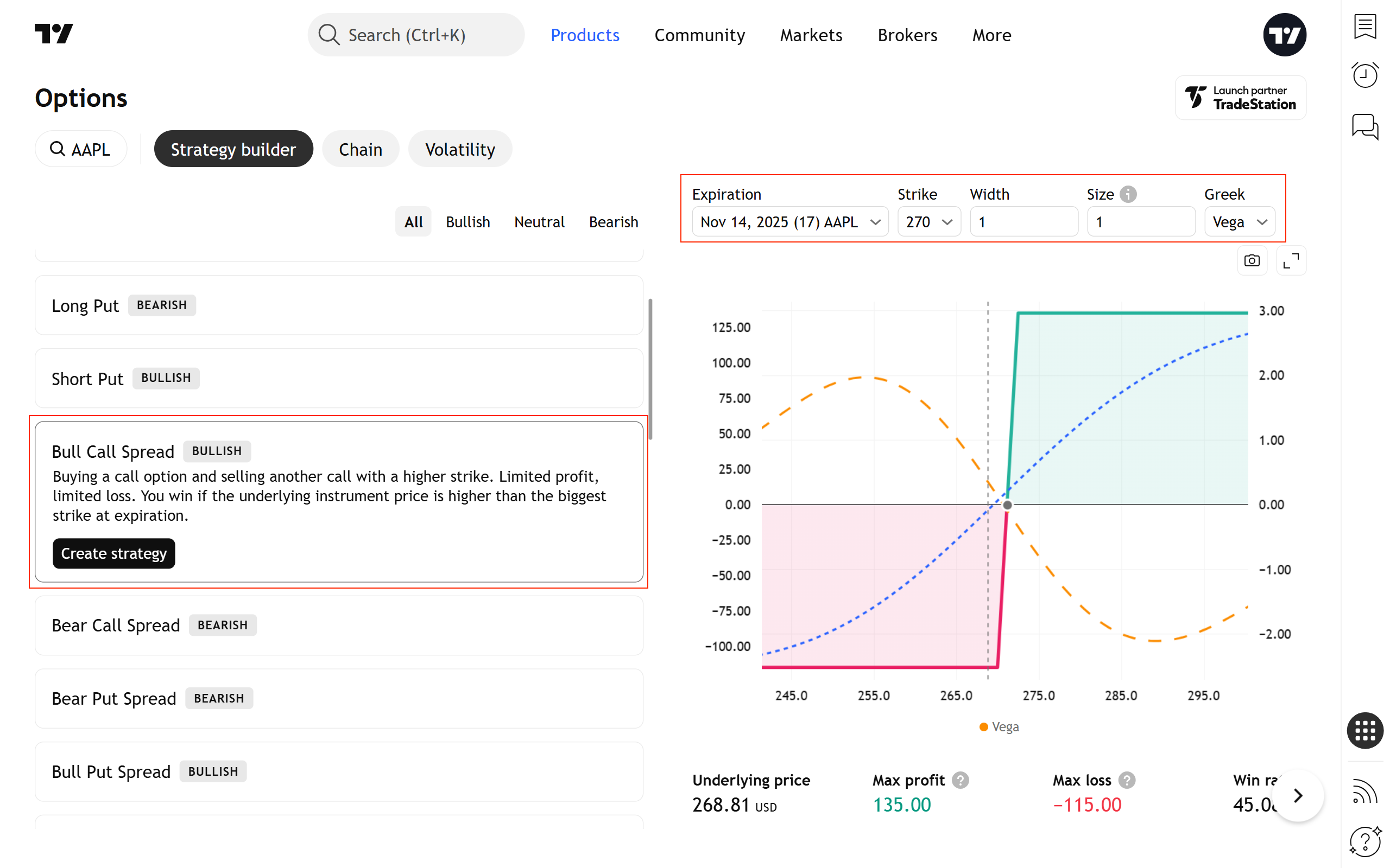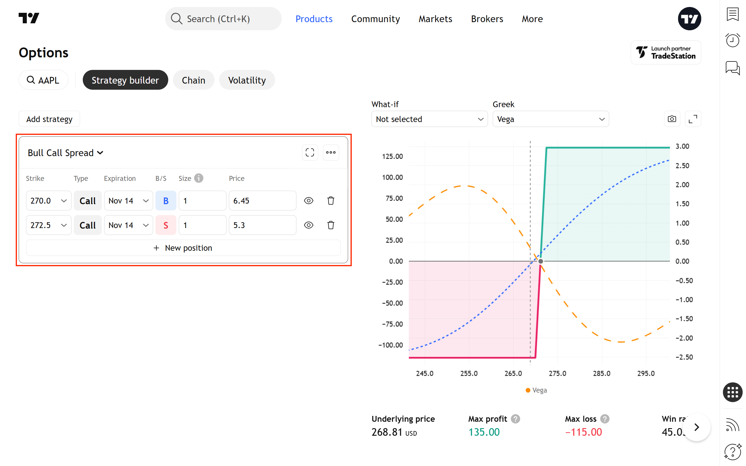 Puede modificar esta estrategia virtual utilizando los controles situados encima del gráfico: cambie el vencimiento, el precio de ejercicio, el tamaño y otros parámetros.