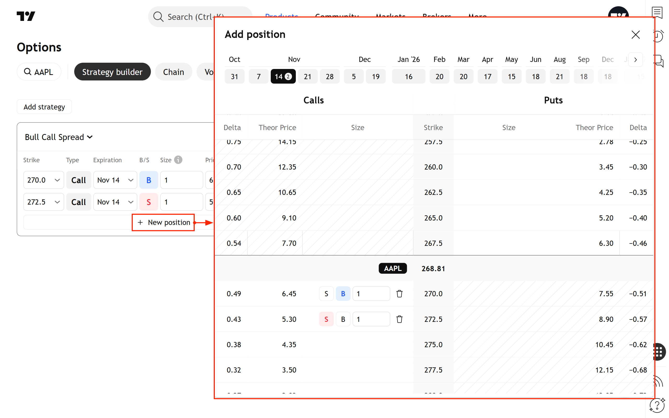 Lo primero que debe intentar es añadir nuevas posiciones a su estrategia. Haga clic en el botón «+ Nueva posición» debajo de la tabla de posiciones. Aparecerá un cuadro de diálogo con una versión especial de la cadena de opciones. Esta cadena no incluye la mayor parte de los datos disponibles en una cadena normal. En su lugar, tiene una columna Tamaño, que muestra las posiciones existentes y le permite añadirlas o eliminarlas.