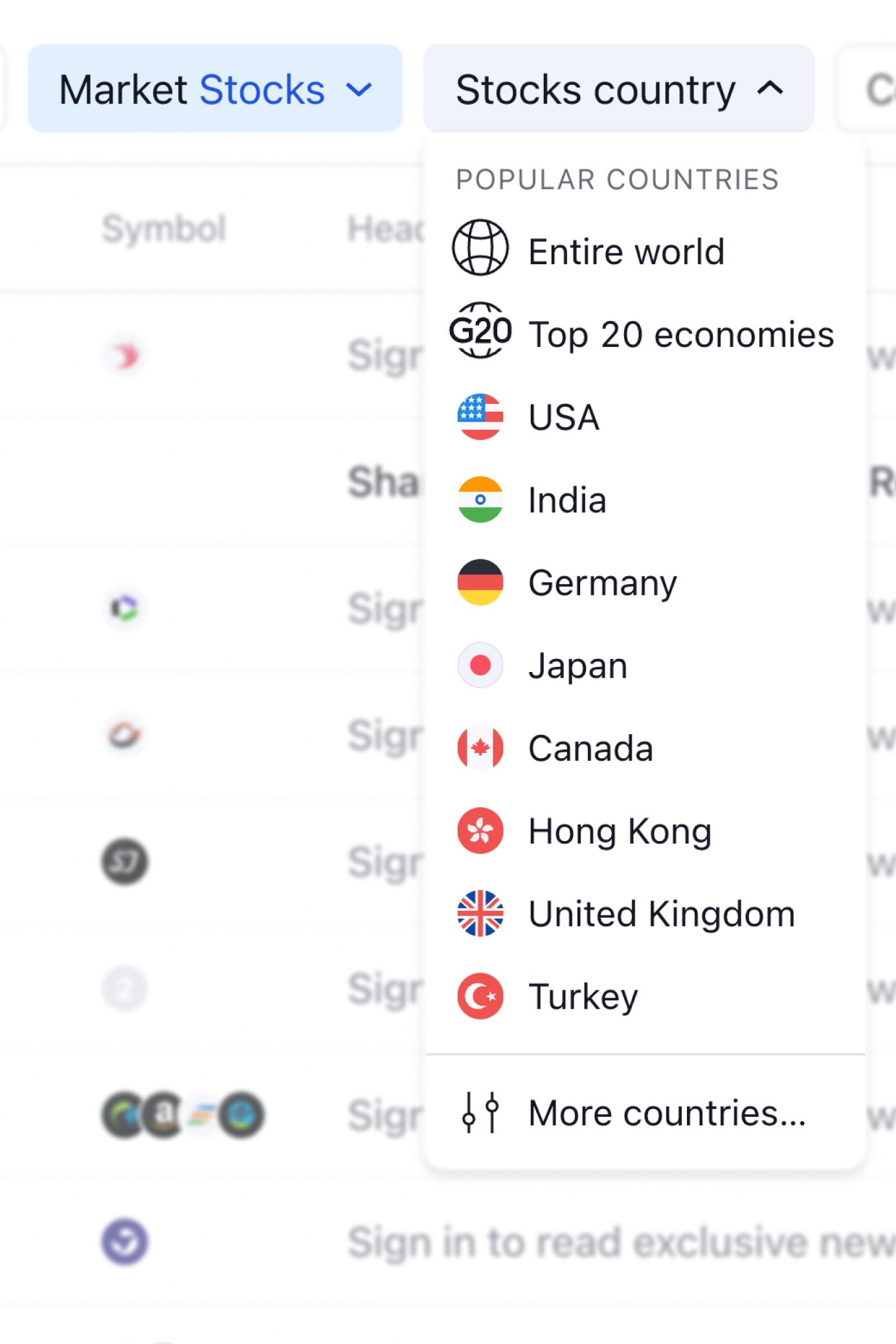 El menú desplegable de países con existencias contiene una lista de países populares. Puede seleccionar un país en el menú desplegable. Si no se establece el país de las acciones, el resultado de la filtrado son noticias sobre acciones de todo el mundo.