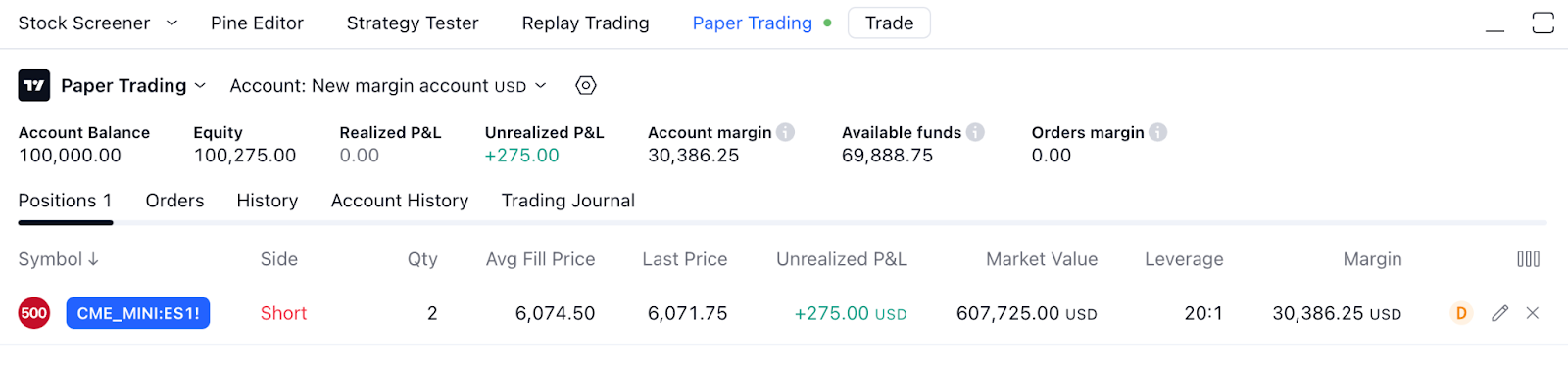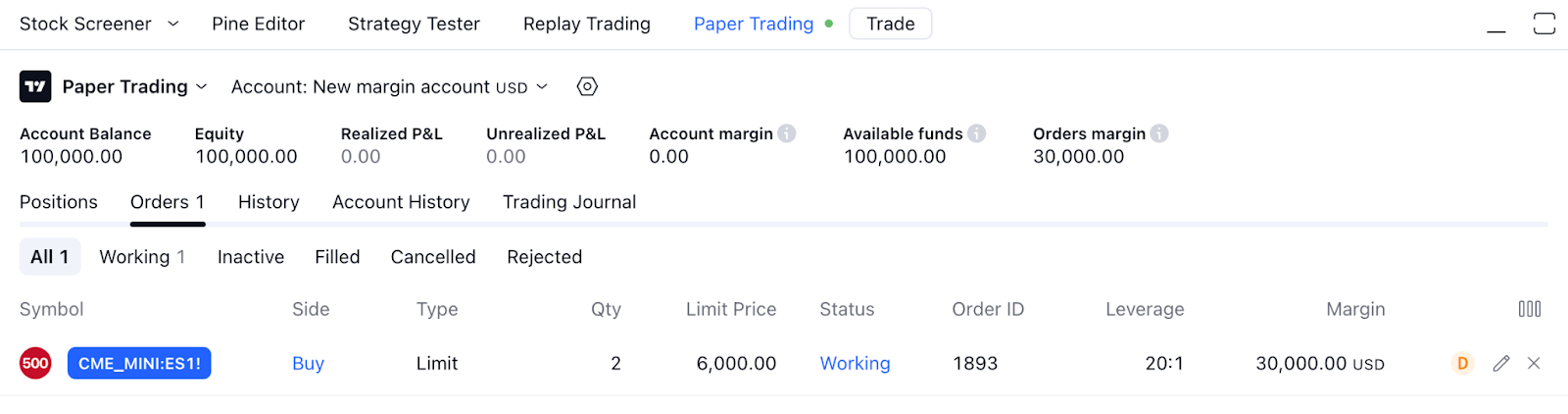 Tenga en cuenta que TradingView no proporciona servicios de negociación con margen real y solo imita el comportamiento de los brokers reales para entrenar y mejorar las estrategias de trading de los usuarios en un entorno libre de riesgos.