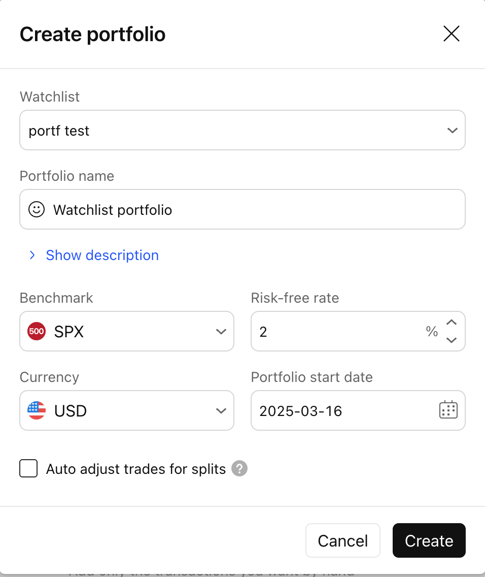 Nota: al crear una cartera de este modo, las transacciones en efectivo correspondientes no se añadirán automáticamente. Por favor, añádalas manualmente para que los cálculos métricos sean correctos.