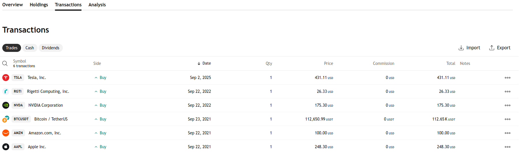 - Importar: seleccione un archivo CSV local para cargar el historial de transacciones. Por defecto, las transacciones se fusionan con las existentes. Cuando la opción Reemplazar historial completo de transacciones está activada, todo el historial de transacciones será reemplazado por las transacciones del archivo. Más detalles en el artículo Cómo añadir transacciones mediante la importación de archivosNota: durante la fusión, solo se añaden operaciones únicas. Si todos los parámetros de una operación de la cartera y del archivo de importación coinciden, esa operación no se volverá a añadir.