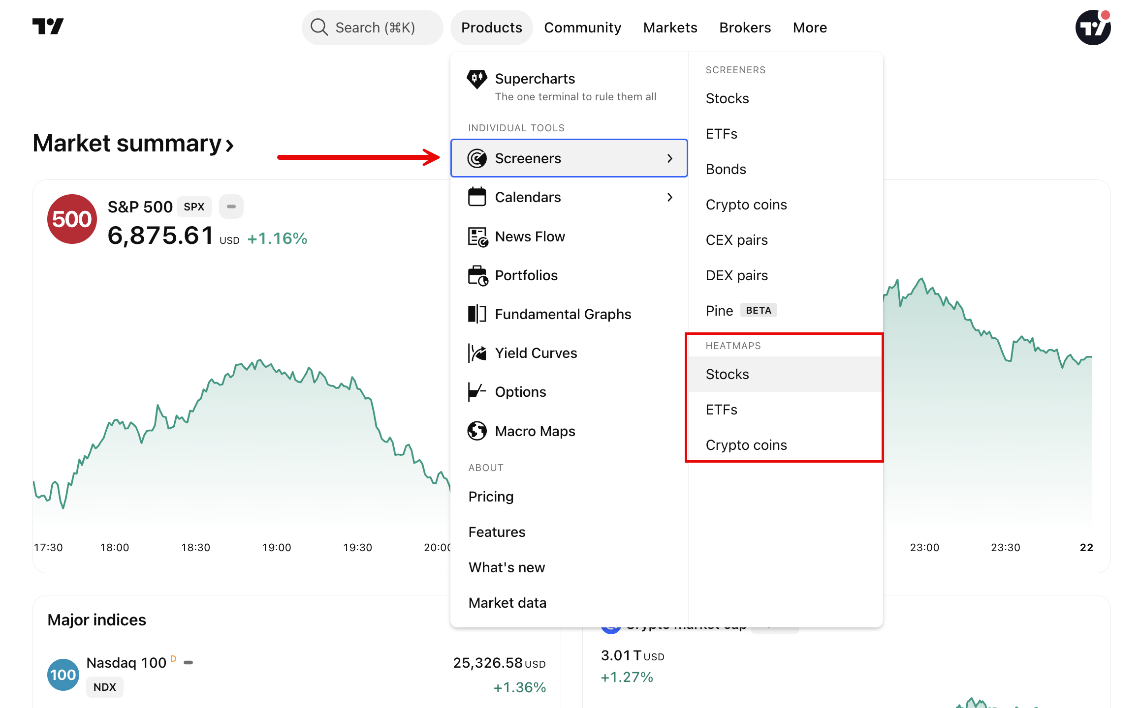 Desde cualquier página de TradingView, pasa el cursor por el menú desplegable «Productos» → «Analizador» y seleccione el mapa de calor que necesite.