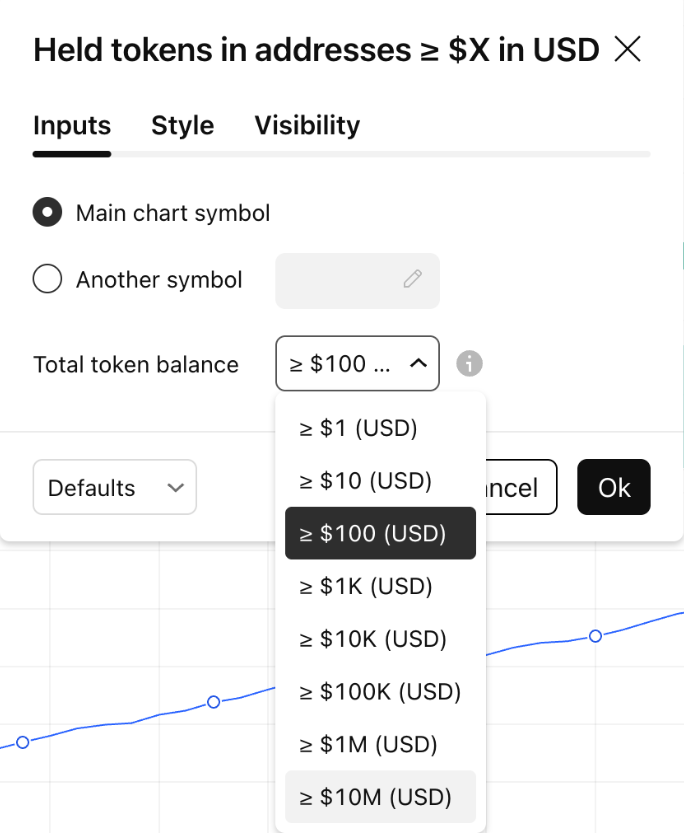 Los tokens mantenidos en direcciones ≥ X (USD) se calculan sumando los saldos de todas las direcciones donde (saldo × precio actual en USD) ≥ X. Los usuarios pueden ajustar el parámetro X en la configuración del indicador para analizar la concentración del suministro en diferentes niveles económicos.