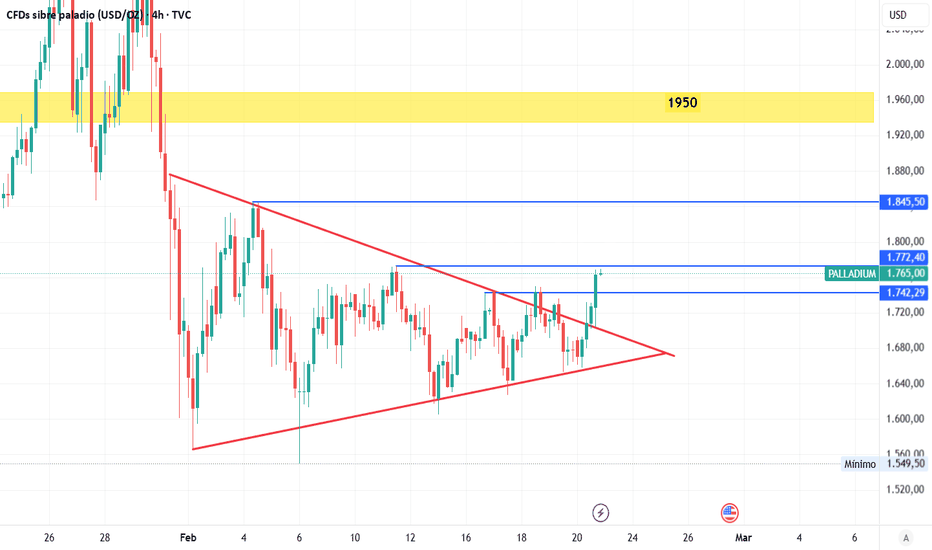 PALLADIUM RUPTURA ALCISTA DE LA CUÑAParece que el palladium nos está indicando en el gráfico de 4 horas que estamos dejando atrás la secuencia de máximos decrecientes. Comenzamos a ver un rebote más claro tras la ruptura de la cuña bajista que se venía formando desde el 30 de enero.