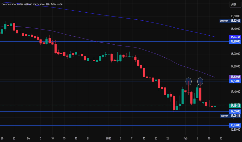 USDMXN busca mínimos históricos: presión renovada sobre el MXNEl renovado impulso del dólar en las últimas semanas ha ejercido una presión significativa sobre el peso mexicano, así como sobre la mayoría de monedas que cotizan frente al USD. Esta dinámica abre la puerta a recorridos bajistas profundos en el par, en línea con la estructura macro que continúa favoreciendo la fortaleza del dólar.