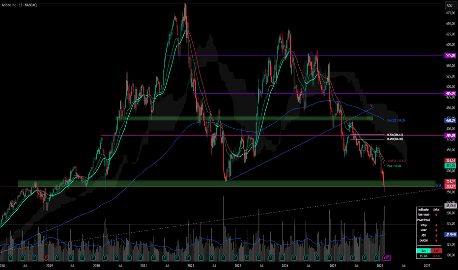 ADOBE: ¿deberíamos volver a comprar pronto?Adobe desarrolla software icónico como Photoshop, Illustrator, Acrobat y Premiere Pro, principalmente comercializado mediante suscripciones en la nube. Mientras que el sector tecnológico estadounidense ha estado en una fuerte tendencia alcista en los últimos meses, la acción de Adobe ha caído más de